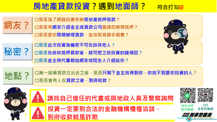 您是否曾有接獲房地產投資相關訊息?或要您用房產抵押貸款?小心這一切都是詐騙喔!詐騙集團會假扮金融機構或公正第三方來取信被害人,安南地政呼籲,房產交易請小心查證 多方洽詢為宜。請找自己信任的地政人員(或代書)及警察詢問,投資一定要到合法的金融機構櫃檯洽談喔。
